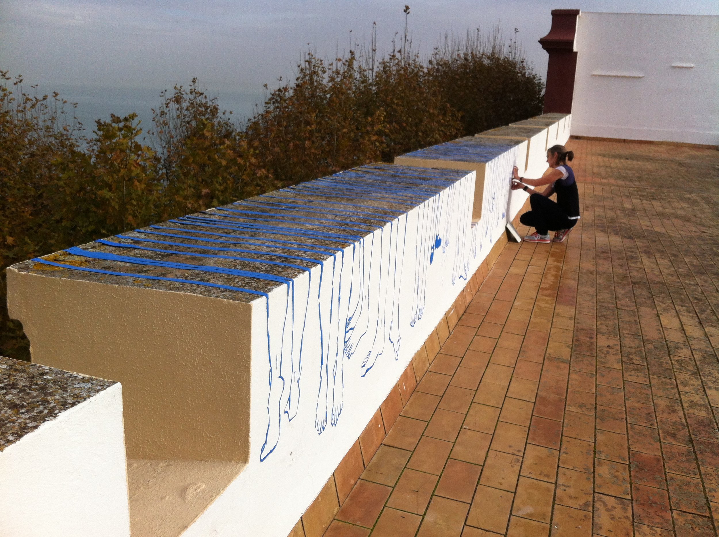 Blue temporary painter’s tape (one pair of feet added each day over a sixteen-day period)